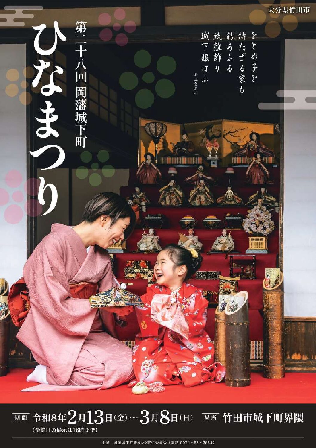 城下町界隈に、華やかなおひなさまたちが並ぶ「第28回岡藩城下町ひなまつり」を今年も開催いたします。