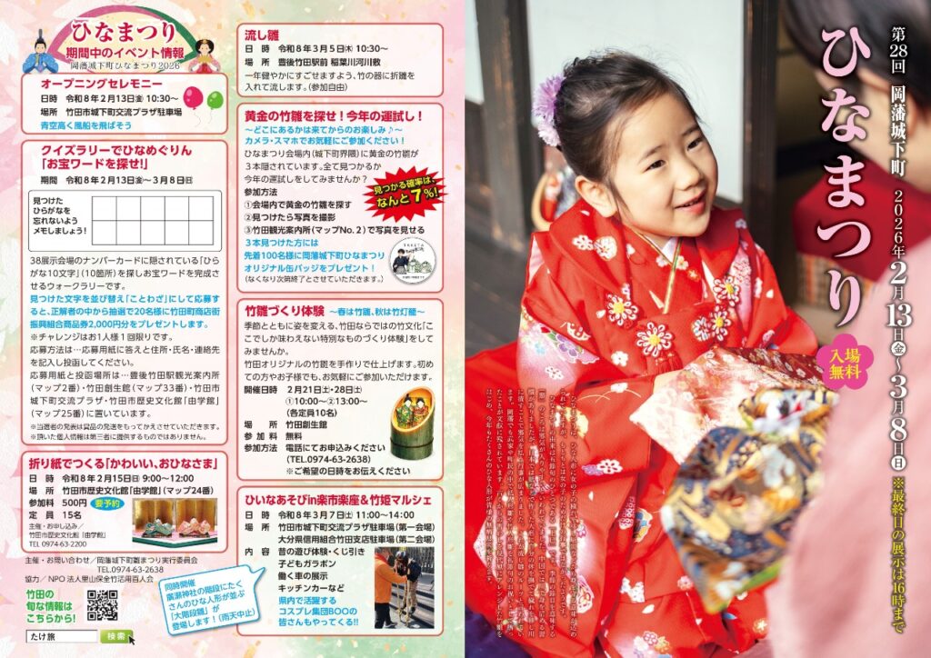 期間中は、「ひいなあそび」や竹田市ならではの「竹雛づくり体験」等、さまざまなイベントも実施されます。展示とあわせて、春の城下町散策をぜひお楽しみください。