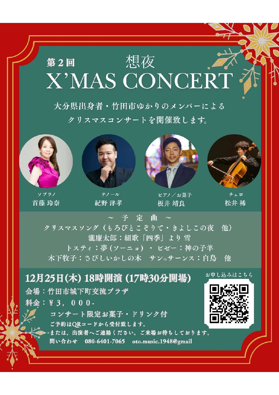 12/25に城下町交流プラザにて、大分県出身者・竹田市ゆかりのメンバーによるクリスマスコンサートを開催致します。 【日時】2025年12月25日(木) 17時30分開場 18時00分開演 […]