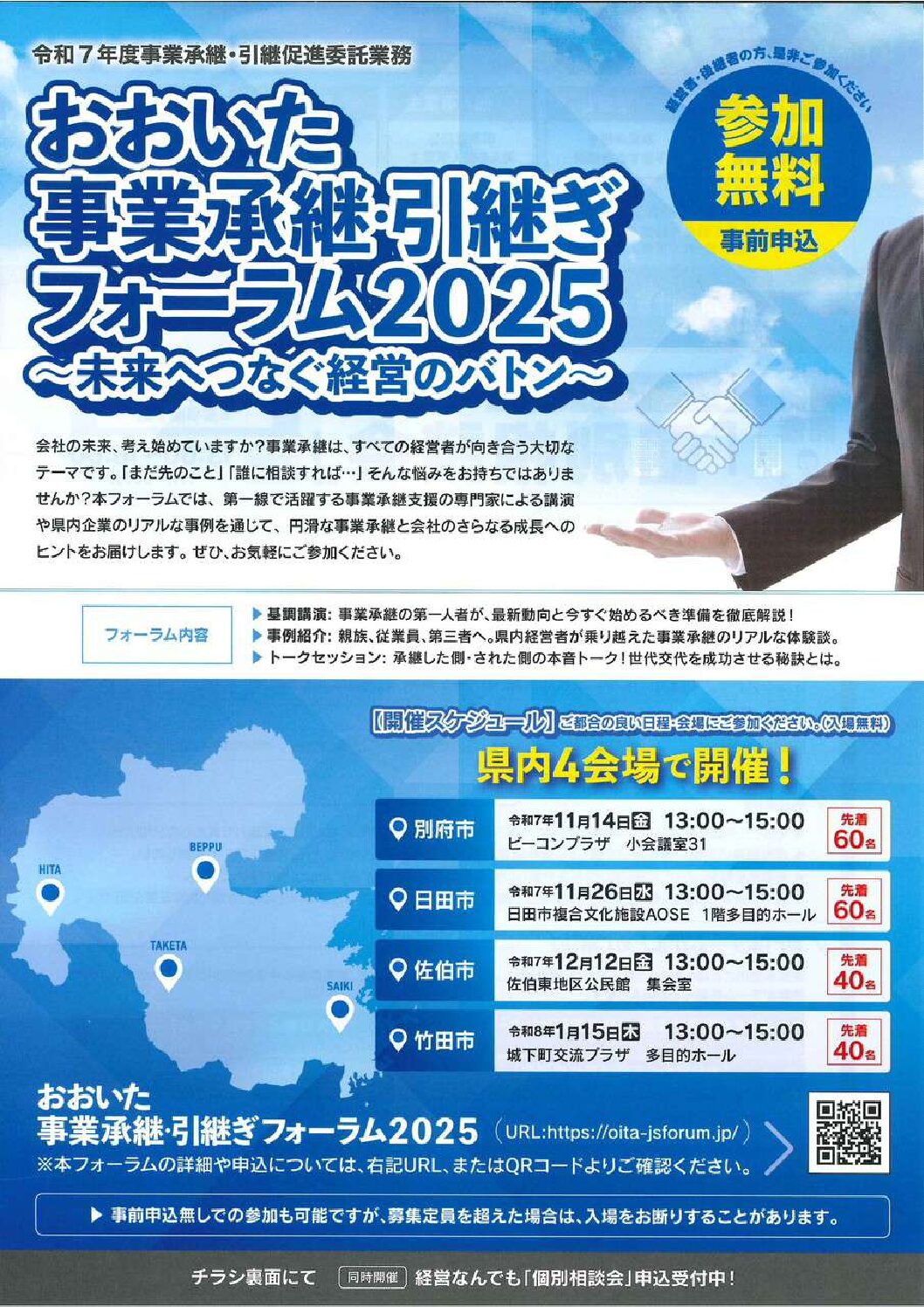 おおいた事業継承・引継ぎフォーラム2025(https://www.taketa-cci.or.jp/posts/4pLIRp12) 第一線で活躍する事業継承支援の専門家による講演や県内企業のリアルな事例を通じて、円滑な […]