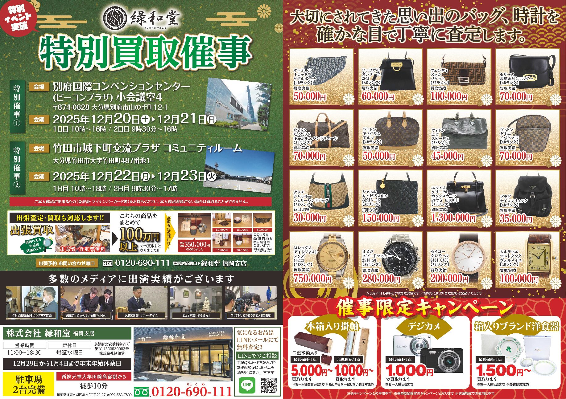 城下町交流プラザ コミュニティルームにて12/22㈪~12/23㈫ 緑和堂 『特別買取催事』が開催されます。 日 時 :2025/12/22㈪~12/23㈫ 22日 10:00-18:00 2 […]