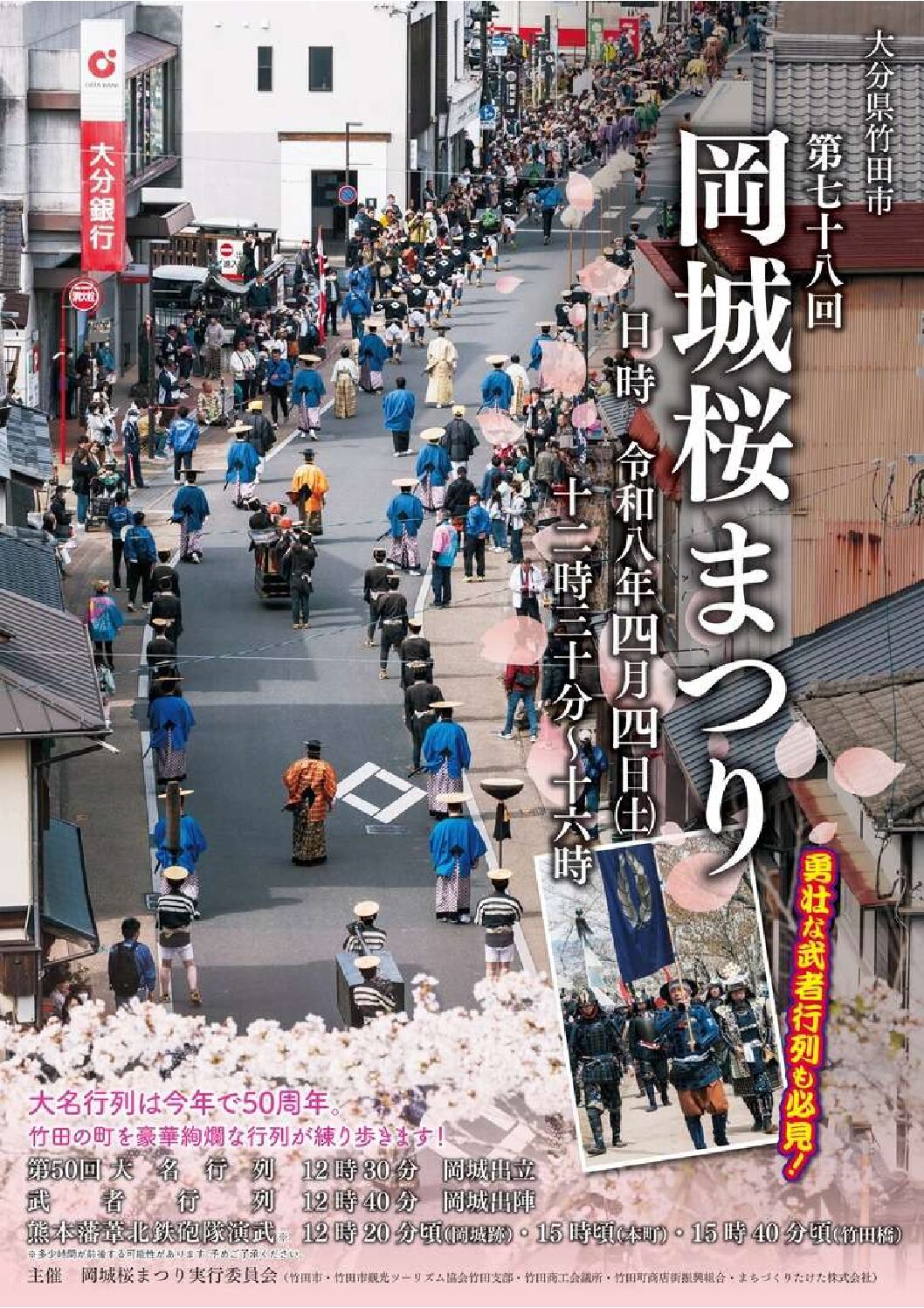 2026年4月4日(土)に「第78回岡城桜まつり」を開催いたします。大名行列は今年で50周年を迎えます。歴史ある岡城跡と城下町を舞台に、大名行列や武者行列など豪華絢爛な行列が練り歩きます。皆さまのお越しを心よりお待ちして […]